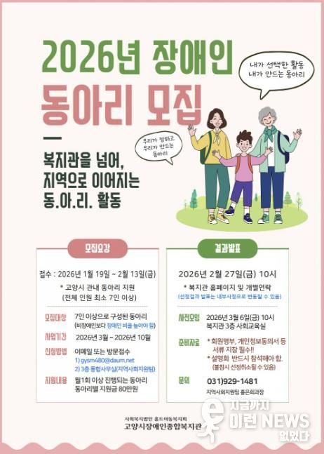 이런뉴스(e-runnews) 김삼성 기자 | 고양시장애종합복지관은 장애인이 주체가 되어 문화·여가 활동을 기획하고 운영할 수 있도록 지원하는 ‘2026년 장애인동아리지원사업’에 참여할 동아리를 모집한다.