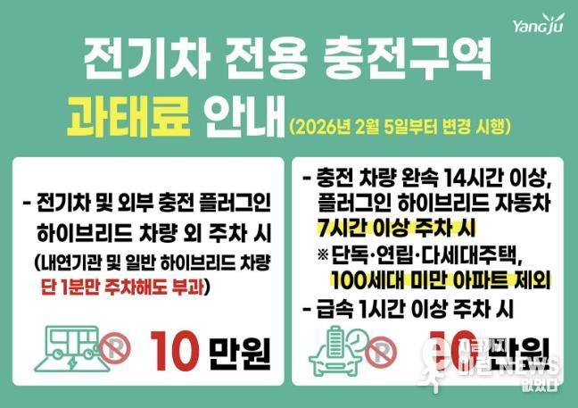 이런뉴스(e-runnews) 김삼성 기자 | 양주시는 오는 2월 5일부터 시행되는 '환경친화적 자동차의 요건 등에 관한 규정' 개정에 따라 전기차 충전구역 주차기준이 변경된다고 전했다.