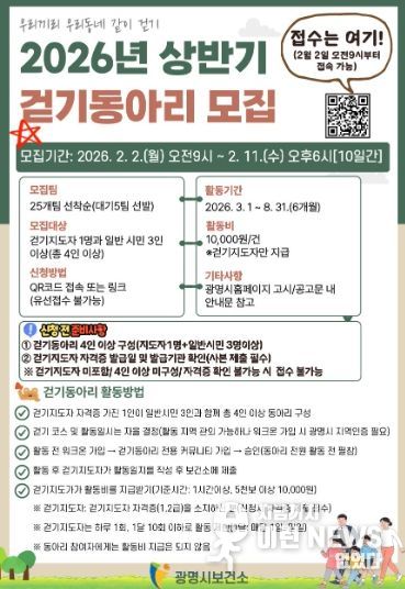 이런뉴스(e-runnews) 김삼성 기자 | 광명시가 시민의 건강 증진과 일상 속 걷기 문화 확산을 위해 오는 2월 2일부터 11일까지 ‘2026년 상반기 걷기동아리’ 참가팀을 모집한다.