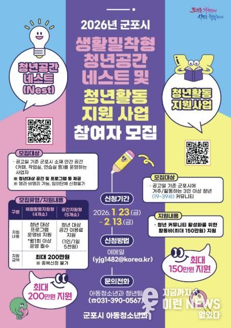 이런뉴스(e-runnews) 김삼성 기자 | 군포시는 지역 청년들의 다양한 활동을 지원하는 생활밀착형 청년공간 ‘네스트(Nest)’ 및 청년활동지원 사업 참여자를 2월 13일까지 각각 모집한다.
