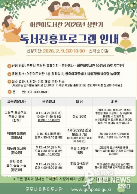 이런뉴스(e-runnews) 김삼성 기자 | 군포시 어린이도서관은 오는 3월부터 새학기를 맞은 어린이들이 책 읽기의 즐거움과 성취감을 느끼고 꾸준한 독서활동으로 기초 학력을 향상시킬 수 있도록 2026년 봄학기 독서 진흥프로그램을 운영한다고 밝혔다.