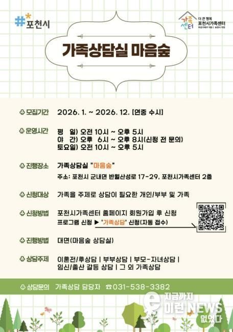 최선희 포천시가족센터장은 “가족상담실 ‘마음숲’은 가족 구성원 간 상호 이해를 높이고 관계 회복을 돕는 역할을 꾸준히 수행해 왔다”며 “앞으로도 부부와 부모‧자녀, 청소년 등 다양한 가족이 필요할 때 전문적인 상담을 받을 수 있도록 지원을 이어가겠다”고 말했다.