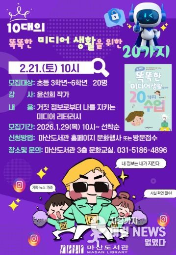이런뉴스(e-runnews) 김삼성 기자 | 김포시 마산도서관은 오는 2월 21일 오전 10시, 초등 3학년~6학년을 대상으로 어린이 프로그램 '10대의 똑똑한 미디어 생활을 위한 20가지'를 운영한다.