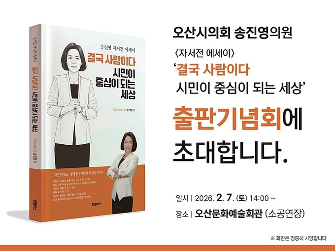 이런뉴스(e-runnews) 김삼성 기자 | 오산시의회 송진영 의원이 오는 2월 7일 오후 2시 오산문화예술회관에서 『결국 사람이다 시민이 중심이 되는 세상』 출판기념회를 개최한다.