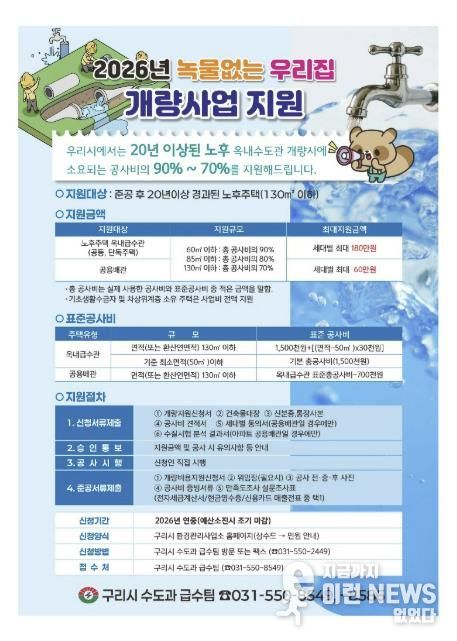 이런뉴스(e-runnews) 김삼성 기자 | 구리시는 2026년 수도관 개량 공사비 지원 사업의 신청을 오는 2월 2일부터 접수한다고 밝혔다.