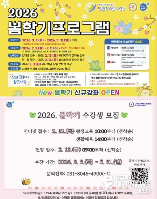 만안청소년수련관은 3월 3일부터 5월 31일까지 봄학기 강좌를 운영하며, 총 141개 강좌, 245개 반을 개설한다. 수강 신청은 2월 13일부터 온라인 접수, 2월 14일부터 현장 방문 접수가 가능하며, 모든 강좌는 선착순으로 모집한다.