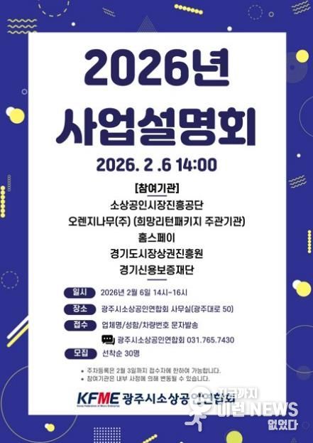 설명회는 오는 6일 오후 2시부터 4시까지 광주시소상공인연합회 사무실(광주대로 50)에서 열린다. 이날 행사에는 소상공인시장진흥공단, 홈스페이, 경기신용보증재단, 경기도시장상권진흥원이 참여해 기관별 2026년도 지원정책과 주요 사업을 설명할 예정이다. 참석자들은 정책 자금, 경영 개선 지원사업 등 분야별 정보를 한 자리에서 확인할 수 있다.