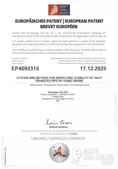 이런뉴스(e-runnews) 김삼성 기자 | 성남시가 자체 개발한 ‘드론을 이용한 열수송관 안정성 검사 시스템’이 유럽특허(등록번호 EP4092315) 등록을 완료했다고 밝혔다. 이는 시 최초의 해외특허 등록 사례로, 지식재산의 해외 권리화를 통해 유럽 수출길을 여는 계기가 될 것으로 기대된다.