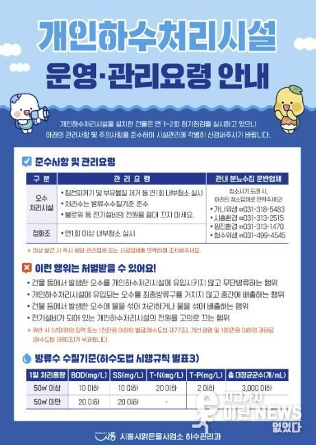 이런뉴스(e-runnews) 김삼성 기자 | 시흥시는 하천 수질 오염을 예방하고 쾌적한 생활환경을 조성하기 위해 3월부터 관내 개인하수처리시설에 대한 지도점검을 본격적으로 실시한다.