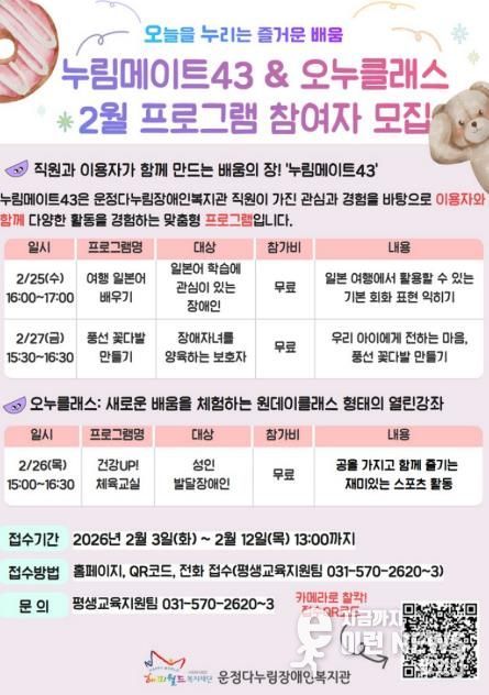 이런뉴스(e-runnews) 김삼성 기자 | 파주시 운정다누림장애인복지관은 참여형 평생학습 프로그램 ‘누림메이트43’을 운영하며, 정규 강좌로는 담기 어려운 소규모 학습 수요를 반영한 생활 밀착형 배움을 실천하고 있다.