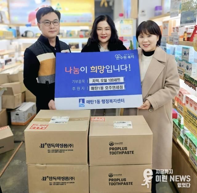 이런뉴스(e-runnews) 김삼성 기자 | 영통구 매탄1동 행정복지센터는 지난 3일 호주면세점직영할인점 매탄점이 설 명절을 맞이해 매탄1동 행정복지센터에 프로폴리스 치약 100개, 오일 관절크림 100개를 후원했다고 밝혔다.