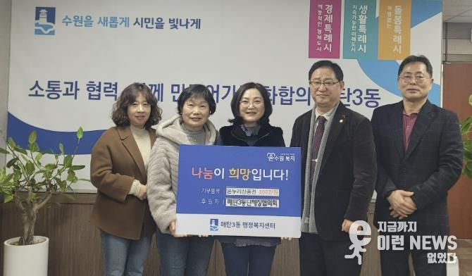 이런뉴스(e-runnews) 김삼성 기자 | 수원시 영통구 매탄3동은 지난 3일 매탄3동 단체장협의회가 다가오는 설 명절을 맞아 관내 어려운 이웃들을 위해 누리상품권 300장(총 300만원 상당)을 기부했다고 밝혔다.