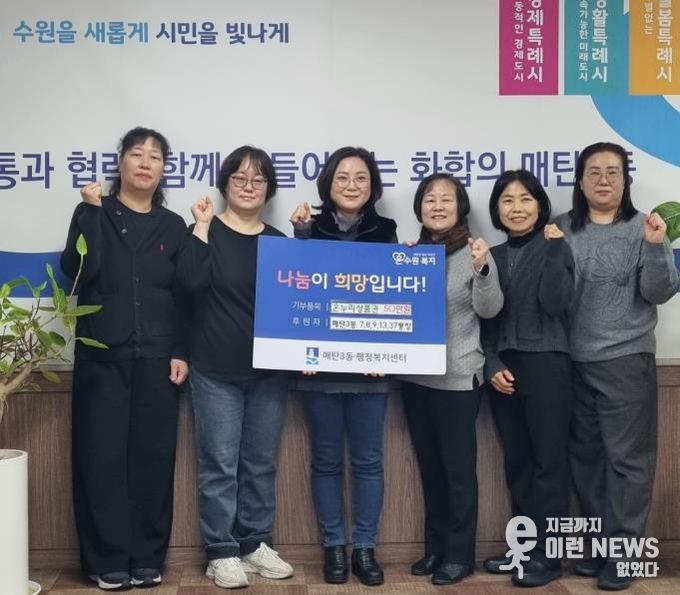 이런뉴스(e-runnews) 김삼성 기자 | 수원시 영통구 매탄3동은 지난 3일 매탄3동 7, 8, 9, 13, 37통장 일동이 설 명절을 맞아 관내 어려운 이웃들에게 온누리상품권 50만원을 기부했다고 밝혔다.