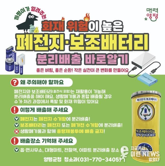 이런뉴스(e-runnews) 김삼성 기자 | 양평군은 최근 보조배터리와 충전용 전지를 일반쓰레기로 배출해 수거·처리 과정에서 화재가 발생할 우려가 커짐에 따라, 해당 폐기물을 반드시 폐전지 수거함에 배출해 줄 것을 군민들에게 적극 홍보하고 있다고 밝혔다.