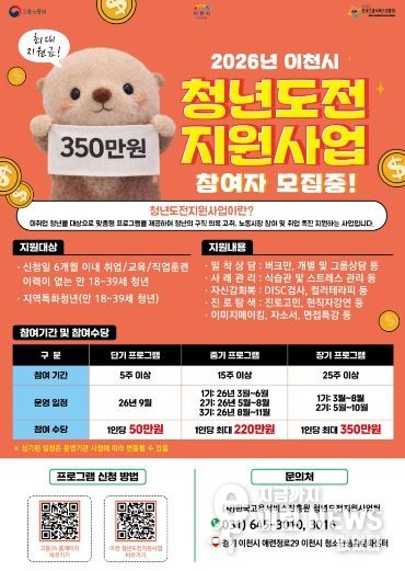 이런뉴스(e-runnews) 김삼성 기자 | 이천시는 지역 내 미취업 청년들의 진로 탐색과 취업역량 강화를 위해 운영하는 ‘청년도전지원사업’의 참여자를 2월 4일부터 모집한다고 밝혔다.