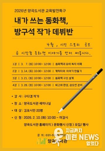 이런뉴스(e-runnews) 김삼성 기자 | 김포시 양곡도서관은 오는 3월 7일부터 3월 28일까지 매주 토요일, 시민을 대상으로 한 그림책 글쓰기 수업 '내가 쓰는 동화책, 방구석 작가 데뷔반'을 운영한다.