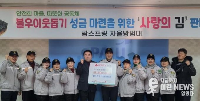 팜스프링 자율방범대는 지난 1월 30일 금촌3동 행정복지센터를 방문해 현금 100만 원을 전달했다. 이번 기탁금은 자율방범대원들이 직접 발로 뛰며 진행한 ‘사랑의 김 판매’수익금으로 마련되어 그 의미를 더했다.