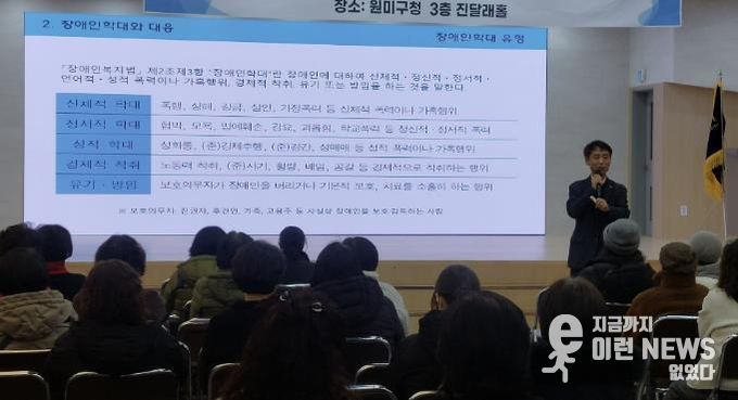 이날 교육은 곽병권 부천시장애인인권센터장이 강사로 나서 장애와 인권, 장애인 학대 및 대응 방법, 장애 유형별 소통과 지원, 인권센터 대응 사례, 활동지원사 신고 사례 등을 중심으로 진행됐다.