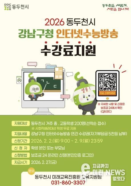 이런뉴스(e-runnews) 김삼성 기자 | 동두천시는 사교육비 부담을 경감하고 교육 격차를 해소하기 위해 관내에 거주하는 중·고등학생을 대상으로 강남구청 인터넷수능방송 연간 수강료 지원 사업을 추진하고 있다.