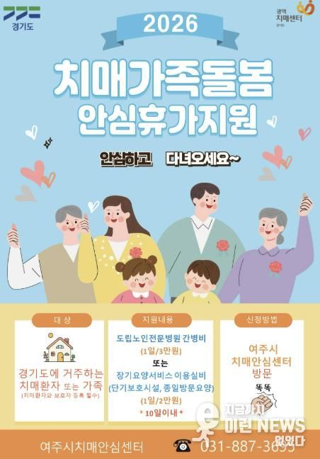 이런뉴스(e-runnews) 김삼성 기자 | 여주시치매안심센터는 2026년에도 치매환자를 돌보는 가족이 잠시나마 돌봄에서 벗어나 휴식을 취할 수 있도록『치매가족돌봄 안심휴가제』를 지속적으로 운영한다.