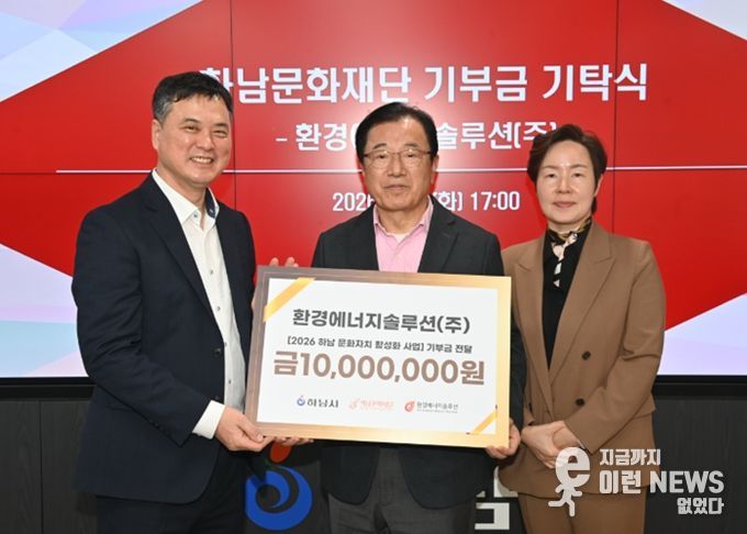 이런뉴스(e-runnews) 김삼성 기자 | (재)하남문화재단은 2월 4일, 하남시청에서 환경에너지솔루션㈜으로부터 문화자치 활성화를 위한 기부금 1천만 원을 전달받았다고 밝혔다. 이날 기부식에는 이현재 하남시장을 비롯해 기업 및 재단 관계자들이 참석해 지역 상생과 ESG 실천의 의미를 공유했다.
