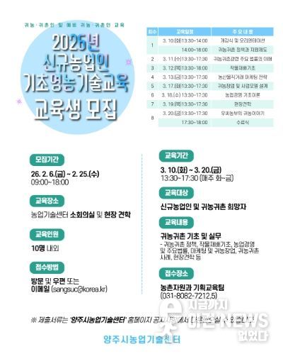 이런뉴스(e-runnews) 김삼성 기자 | 양주시는 농촌지역으로 이주한 귀농․귀촌인과 예비 귀농인의 안정적인 농촌 정착을 지원하기 위해 ‘2026년 신규농업인 기초영농기술교육’ 교육생을 모집한다.
