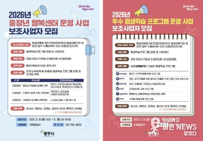 이번 공개모집은 ▲중장년 행복센터 운영사업 ▲우수 평생학습 프로그램 지원사업 등 2개 사업을 대상으로 한다. 모집 기간은 2월 9일부터 20일까지이며 신청 대상은 비영리 법인·단체와 학교 등이다.