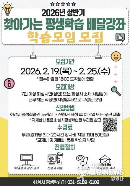 이런뉴스(e-runnews) 김삼성 기자 | 화성특례시는 2월 19일부터 2월 25일까지 2026년 상반기'찾아가는 평생학습 배달강좌'학습모임을 모집한다.