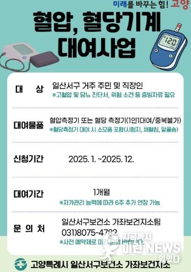 이런뉴스(e-runnews) 김삼성 기자 | 고양특례시 일산서구보건소 가좌보건지소는 일산서구 주민들 중 고혈압, 당뇨 유질환자이거나 전 단계 소견을 받은 주민들을 대상으로 혈압·혈당계 대여사업을 진행한다고 밝혔다.