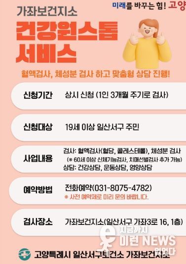 건강원스톱 서비스는 사전 예약제로 운영되며, 참여를 희망하는 주민은 가좌보건지소팀으로 문의하면 된다.