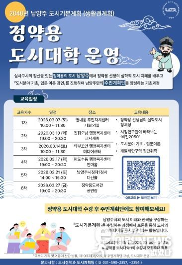 강연은 시민 참여 기회 확대를 위해 권역별로 나눠 총 6회에 운영한다. 일정은 △1차 7일 별내동 주민자치센터 △2차 10일 진접오남행정복지센터 △3차 14일 와부조안행정복지센터 △4차 17일 화도수동행정복지센터 △5차 21일 시청 다산홀 △6차 27일 정약용도서관 순이다.