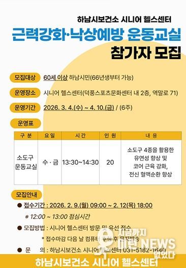 이런뉴스(e-runnews) 김삼성 기자 | 하남시보건소는 오는 2월 9일부터 12일까지 시니어를 대상으로 ‘2026년 근력강화,낙상예방 운동교실 1기’ 참여자를 모집한다.