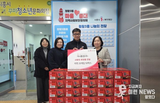 이런뉴스(e-runnews) 김삼성 기자 | 시흥시 정왕3동 지역사회보장협의체에 지난 2월 6일 가나환경(주)이 방문해 설 명절을 맞아 취약계층을 위한 라면 50상자를 기탁했다.