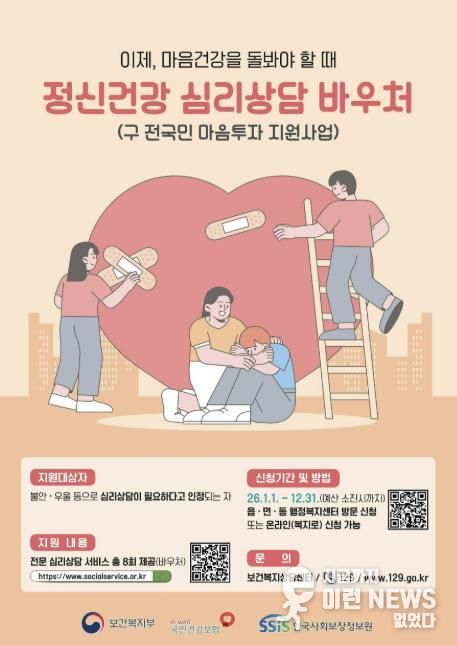 이런뉴스(e-runnews) 김삼성 기자 | 성남시는 우울, 불안, 스트레스 등으로 정서적 어려움을 겪는 시민을 위해 ‘정신건강 심리상담 바우처 사업(옛 전국민 마음투자 지원사업)’을 시행한다고 9일 밝혔다.