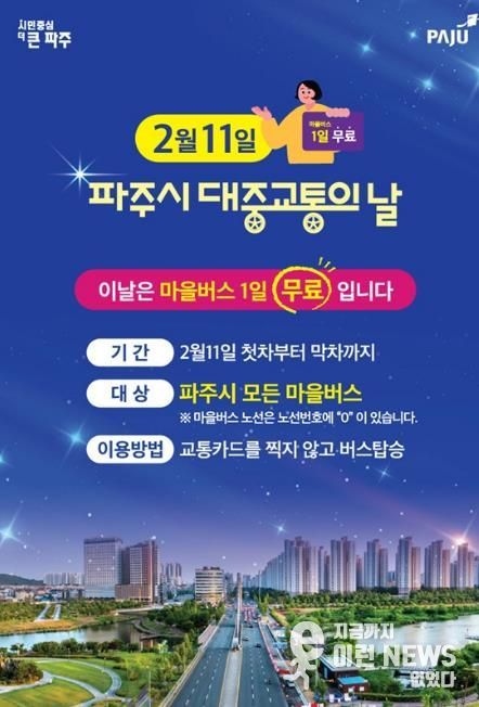 이런뉴스(e-runnews) 김삼성 기자 | 파주시는 ‘대중교통의 날’을 맞아 대중교통 이용 활성화와 시민 교통비 부담 완화를 위해 오는 2월 11일 하루 동안 파주시 전 지역의 모든 마을버스를 무료로 운행한다.