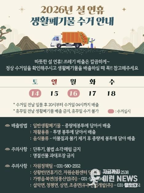 이런뉴스(e-runnews) 김삼성 기자 | 가평군은 설 명절을 맞아 군민과 방문객 모두가 쾌적한 환경에서 청결한 연휴를 보낼 수 있도록 생활폐기물 처리 대책을 마련했다.