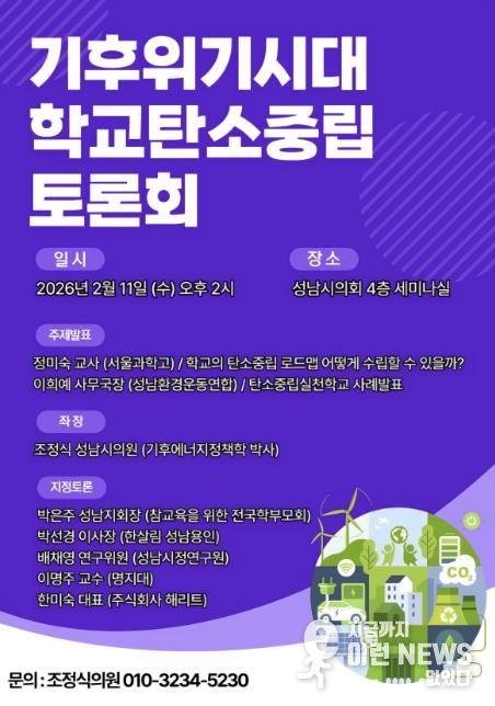 이런뉴스(e-runnews) 김삼성 기자 | 기후위기 대응과 학교 현장의 탄소중립 실천 방안을 논의하기 위한 '기후위기 시대 학교 탄소중립 토론회'가 오는 2026년 2월 11일 오후 2시, 성남시의회 4층 세미나실에서 열린다.