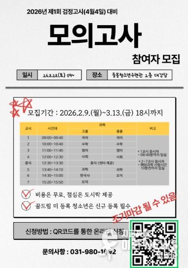 이번 모의고사는 김포시 학교 밖 청소년(중졸, 고졸 검정고시 응시 대상자)을 대상으로 3월 28일 시행되며, 접수는 센터에 등록된 청소년 또는 등록을 희망하는 관내 학교 밖 청소년을 대상으로 진행된다. 모의고사 참여를 희망하는 청소년은 3월 13일 18시까지 온라인 접수(QR코드 참고)를 통해 선착순으로 접수하고 있다.