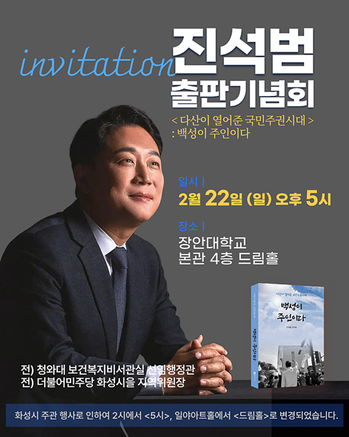 이런뉴스(e-runnews) 김삼성 기자 | 진석범 전 청와대 선임행정관이 오는 2월 22일(일) 오후 5시, 장안대학교 본관 4층 드림홀에서 신간 ‘백성이 주인이다’ 출판기념회를 개최한다.