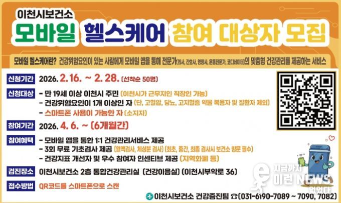 이런뉴스(e-runnews) 김삼성 기자 | 이천시는 스마트폰을 활용한 맞춤형 건강관리 서비스를 제공하는 모바일 헬스케어 사업 대상자를 2월 16일부터 2월 28일까지 선착순으로 모집한다.