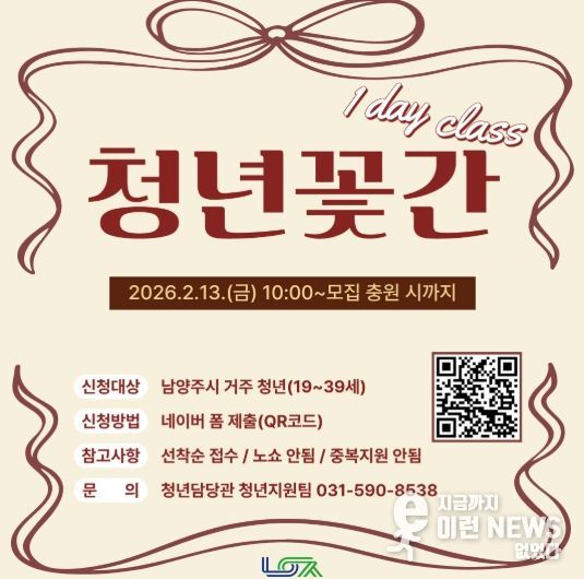 이런뉴스(e-runnews) 김삼성 기자 | 남양주시는 청년들의 문화적 욕구를 충족하고 소통의 기회를 제공하기 위해 2월부터 ‘2026년 청년꽃간 문화 프로그램’을 본격 운영한다고 10일 밝혔다.