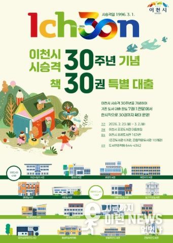 이런뉴스(e-runnews) 김삼성 기자 | 이천시는 시 승격 30주년(시승격일 1996.3.1.)을 기념해 시민의 독서 참여를 확대하고 책 읽는 도시 이천의 정체성을 강화하고자, 오는 2월 23일부터 3월 2일까지 ‘책 30권 특별대출’ 서비스를 운영한다.