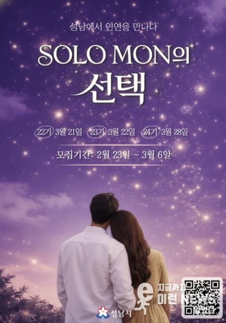 이런뉴스(e-runnews) 김삼성 기자 | 성남시는 오는 2월 23일부터 3월 6일까지 ‘솔로몬(SOLO MON)의 선택’ 22~24기 행사 참가 희망자 300명(남녀 각 150명)을 모집한다.