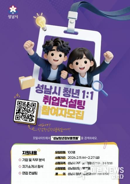 성남시 관계자는 “이번 1대1 취업 컨설팅을 통해 청년들의 취업 역량과 자신감을 높여 실질적인 구직 성과로 이어지길 기대한다”고 말했다.
