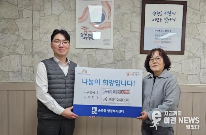 최선정 송죽동장은 “매년 잊지 않고 송죽동 이웃들을 위해 따뜻한 나눔을 실천해주시는 ㈜엑티브아이티에 깊이 감사드린다”며 “기탁해주신 후원금은 도움이 꼭 필요한 가구에 소중히 사용하겠다”고 전했다.