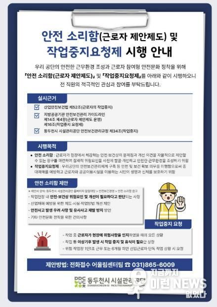‘안전 소리함’과 ‘작업중지요청제’에 대한 자세한 내용은 동두천시 시설관리공단 누리집 알림마당 내 안전보건경영 탭에서 확인할 수 있다.