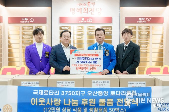 이런뉴스(e-runnews) 김삼성 기자 | 오산시는 지난 13일 오산중앙로터리클럽(회장 김관현) 소속 ㈜화인ENG(대표 김영수)가 다자녀 저소득가정을 지원하기 위해 총 600만 원 상당의 먹거리 및 생필품 50박스를 기탁했다고 밝혔다.