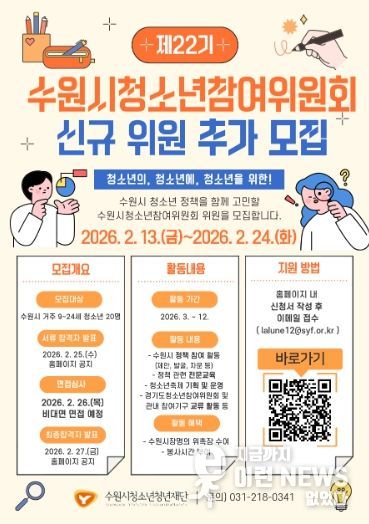 이런뉴스(e-runnews) 김삼성 기자 | 수원시청소년청년재단(이사장 최종진)은 수원시 청소년의 정책 참여 확대와 권익 증진을 위해 '제22기 수원시청소년참여위원회' 위원을 추가 모집한다고 밝혔다.