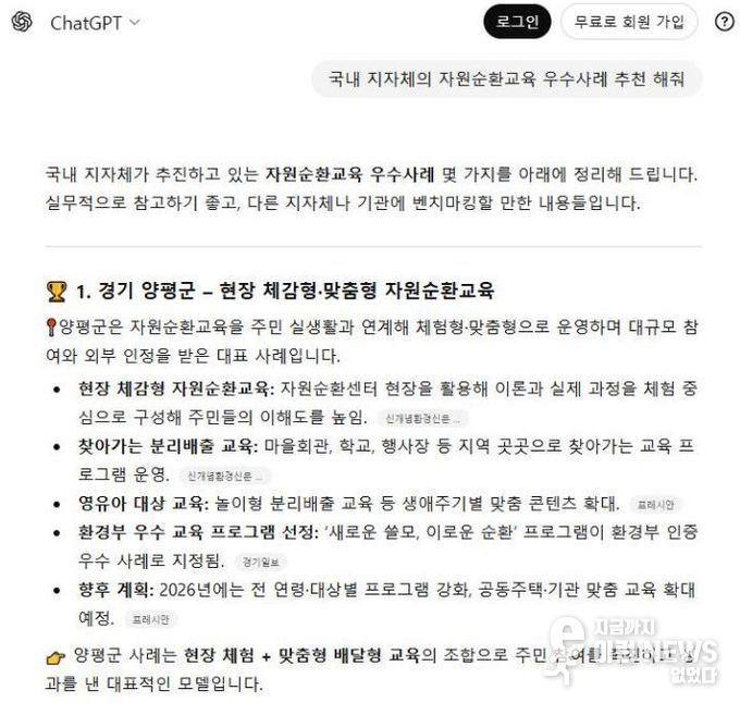 최근 생활과 업무 전반에서 인공지능(AI) 검색 활용이 증가하면서 인공지능 기반 검색 결과 노출과 추천이 정책과 브랜드 인지도 확산에 중요한 요소로 작용하고 있다. 이러한 흐름 속에서 양평군 자원순환교육은 챗지피티(ChatGPT) 등 인공지능 기반 정책 검색 과정에서 우수사례로 소개되고 있으며, 이에 따라 인근 지자체에서 교육 운영 방식과 프로그램 구성에 대한 문의가 이어지는 등 외부 지자체의 관심이 높아지고 있다.