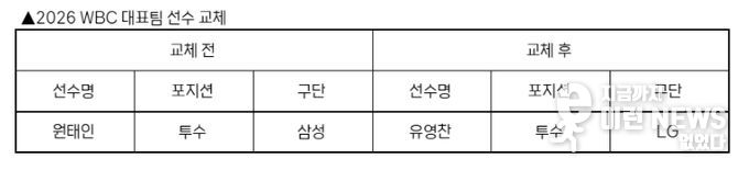 이런뉴스(e-runnews) 김삼성 기자 | KBO 전력강화위원회는 부상으로 인해 WBC 참가가 어려워진 삼성 원태인을 대체할 선수로 LG 유영찬을 확정하고 WBC 조직위에 선수 교체 승인을 요청했다.